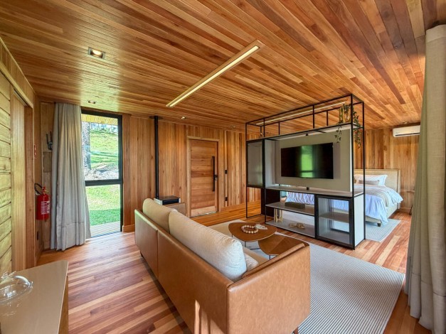 Kajo significa brilho e luz na língua finlandesa, uma referência direta ao sol que ilumina as colinas de Urubici. Com generosos 90 m², esta cabana é um santuário de amplitude e claridade. Projetada para emoldurar a luz natural, a Kajo transforma a paisagem em arte viva, oferecendo um espaço de luxo onde cada detalhe foi pensado para elevar o bem-estar e celebrar o espetáculo do amanhecer na serra.